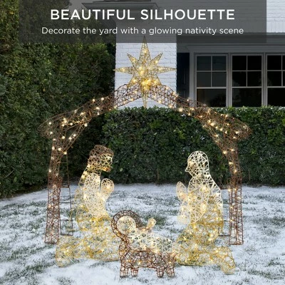 Decorate the yard with a glowing nativity scene, perfect outdoors, indoors, or as the centerpiece of a party or other events. This nativity scene lights up with 190 LED lights, powered by 2-prong power cords. The LED lights are environmentally friendly and remain cool to the touch even after hours of extended use. Don’t be intimidated this piece features an easy assembly; connect pieces, secure them with zip ties, and stake your nativity scene into the grass. Every component is durable and easy to connect. This scene is built to last many Christmases. It comes with a metal frame to keep decor damage-free in the winter months. Metal connections keep the scene secure with easy connection. Lastly, sturdy ties help stabilize the structure. Remember the reason for the season and enjoy the holidays most festively! Product Specifications: Manger (71in x 63in), Baby(17in x 18in), Mary (33.5 x 17in), Joseph (34in x 19in)