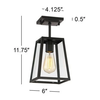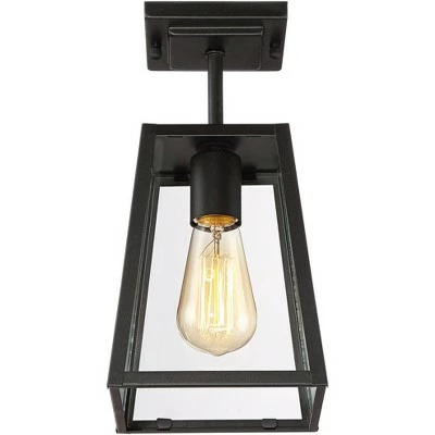 Brighten up your home’s exterior with this semi-flushmount ceiling light from the Arrington collection by John Timberland. This updated industrial design comes in a tapering black frame with a sleek, straight-lined look. Clear glass panels offer a full view of the beautiful vintage Edison style bulb that is included with purchase. Rated for use in damp locations such as covered porches and patios.