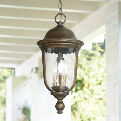 - Rustic traditional outdoor hanging light, from the Havenwood collection by Minka Lavery.