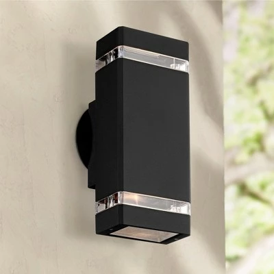 Outfit a contemporary space with this outdoor wall light from the Skyridge collection by Possini Euro Design. It comes in a sleek rectangular frame with a black finish and clear glass accents for a dash of visual interest. Specially designed to shine light from both ends, this fixture can be installed vertically or horizontally to best suit your decorating needs.