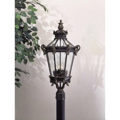 A traditional elegance inspires this beautiful outdoor post mount lantern. It offers timeless beauty with its beveled glass, metal candle sleeves and hand painted ornate Heritageβ’ finish with gold highlights. Pole not included.