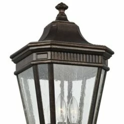 Storied nautical fare casts a spell of intrigue and old-time charm, turning this three-light outdoor post light lantern into a tasteful way to accentuate home and business structures. This traditional style post light is from the Pediment collection by Feiss offers an aged flavor with a dark aged zinc finish over stainless steel construction in a lantern style with ornate silhouetting. Textured glass panels offer a partial view of a candelabra style bulb base (bulbs not included).