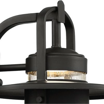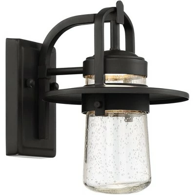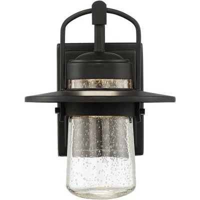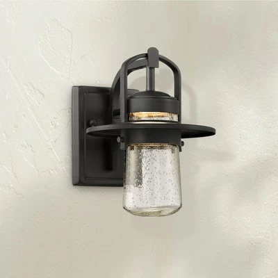 Brighten up a porch or entryway with this outdoor LED wall light. It comes in a strong black finish, and has a wide brim shade and arching rods that contribute to the handsome design. The clear seedy glass creates a rain-flecked look and adds a charming final touch.