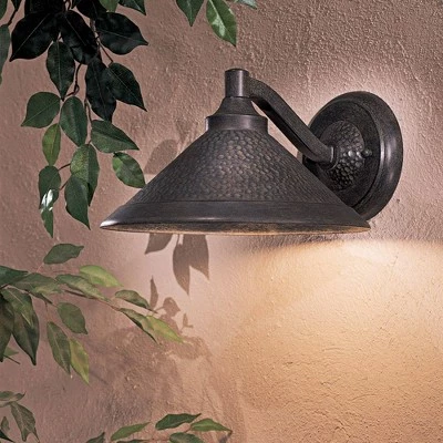 Light the night, but not the night sky, with this Dark Sky regulation approved wall light. A bent arm extends the light housing away from the wall and directs light downward. Rated for full cut-off, the design features a warm hammered aspen bronze finish.