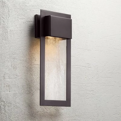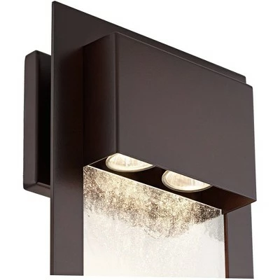 This simple modern outdoor wall light features a flat panel of clear seeded glass in front of two halogen bulbs. A metal trim frame in warm Alder bronze finish enhances the inviting geometric design. A beautiful addition to your home from Minka lighting.