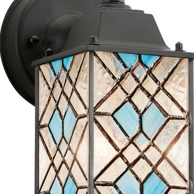 The 1-Light Traditional Black Satin Outdoor Stained Glass Lantern Wall Sconce from River of Goods will grace your entryway, porch or patio with a lovely mix of timeless style and eye-catching detail. This stained glass outdoor light features a durable metal housing in a classic craftsman lantern design, while the artisan stained glass shade is constructed of 152 glass cuts to create a radiant diamond-shaped pattern in icy blue and clear hues, all crafted by hand using traditional artisan techniques. Perfect for entryways, patios or decks, this stained glass outdoor wall lantern is sure to bring an extra touch of color and style you’ll love.