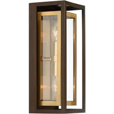 Update the look of a home exterior with this contemporary outdoor wall light. A double box design features an outer oil rubbed bronze finish frame over a brass inner frame with glass panels. The open look adds a freeform feel and keeps the design fresh and timeless.