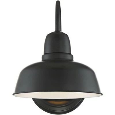 From the Urban Barn collection by John Timberland, this indoor-outdoor wall light comes in a charming industrial farmhouse style. The steel frame features a wide downlight shade attached to the end of a thin, arching gooseneck arm. A smooth black finish adds a classy and refined touch. Perfect for use in a porch or patio area.