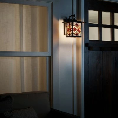 The 1-Light Tiffany Style Bronze Stained Glass Outdoor Lantern Wall Sconce from River of Goods brings a fresh, elegant look to any entryway or patio. This light sconce features a traditional lantern design with a bronze look for vintage-inspired appeal, while the tiffany style shade is crafted using cut and stained glass in red, yellow and clear hues for a bright touch. A geometric pattern creates a charming look you’ll love, and the glass is oil rubbed to help prevent scratches. The housing is made from durable metal to lend lasting use and an authentic look you’ll appreciate. Perfect for entryways, patios or decks, this stained glass lantern is sure to bring elegant charm and extra character to any outdoor space.