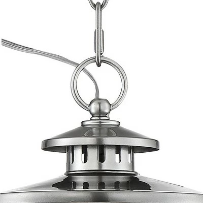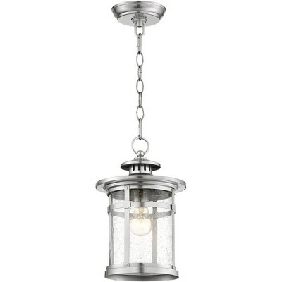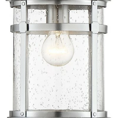 This outdoor hanging light is a modern take on traditional lantern-style fixtures. The clear seedy glass creates a charming rain-flecked look, and the silvery chrome finish offers a clean modern touch. Not only will this light brighten up your porch or entryway, it will add a stylish industrial decorative accent to your home.