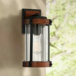 Vertical ribs in a clear glass shade add texture and eye-catching intrigue to this outdoor wall light from John Timberlandยฎ. This impressive wall light is perfect for a grand outdoor kitchen or living area as it shows off a dark wood finish frame and distinctive black finish aluminum accents. This wall light is a single-light fixture that delivers a welcoming glow to your outdoor space.