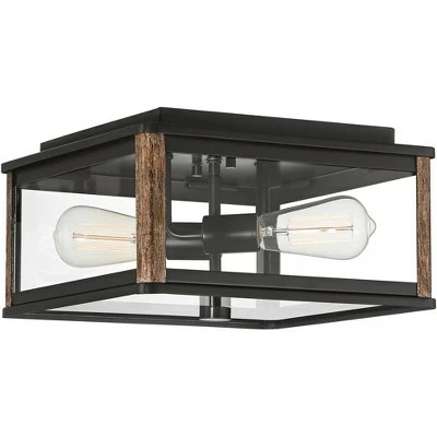 Get an updated farmhouse look with the Wordsworth Field collection by John Timberland. This flushmount outdoor ceiling light comes in a straight-lined square steel frame, covered in dark bronze and wood grain finishes that combine to form a classy rustic-industrial theme. Handsome and versatile, this ceiling light is perfect for a covered porch or patio area.