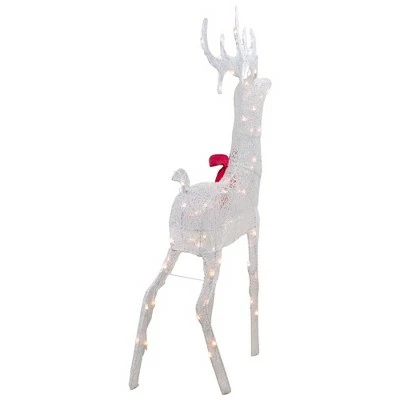 Bright and glorious, this lighted reindeer will effortlessly enhance the beauty of your holiday decoration this season. The body is a white cotton mesh covered with sparkling iridescent glitter. He comes illuminated with 70 clear incandescent mini lights that give a soft warm glow. Product Features:Pre-lit with 70 clear lightsBulb size: miniBulb type: incandescent52″ lead cordSome quick and easy assembly required Sturdy rust resistant metal frameAdditional product features: Fully dimensional designIncludes ground stakesUL certified and approved for indoor and outdoor use Comes with replacement bulbs and fuse Contains 1 plug with an end connector, allowing you to connect multiple decorations together (not to exceed 210 watts) Wire gauge: 22120 volts, 60 hertz, 0.24 amps, 28.8 watts Dimensions: 52″H x 29″W x 12″DMaterial(s): metal/cotton/glass bulbs/wire