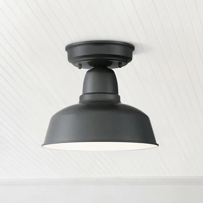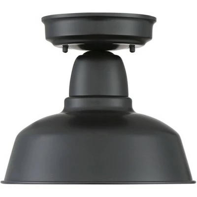 In a classic barn style, this indoor-outdoor ceiling light blends wonderfully in any farmhouse, vintage industrial, or rustic cottage setting. The semi-flushmount profile creates a clean and simple look, and the smooth black finish adds a refined touch.