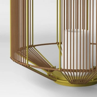 Elevate your outdoor decor with this Tumbler Basket-Weave Outdoor Lantern with LED Candle from Project 62™. Boasting an all-weather construction for protection from the elements, this decorative lantern is sure to add eye-catching flair to your outdoor seating nook. Showcasing an octagonal silhouette with a basket-weave outer in hues of brown and green for a natural look, it features a battery-operated white votive candle at the center with a slide switch at the bottom for easy illumination. Plus, the handle on top makes it easy to carry around. Place it at the doorway, near the outdoor dining table or aside an outdoor coffee table to add chic style to your soirees.