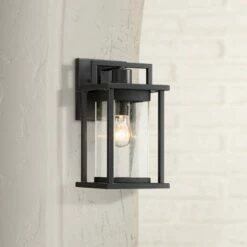 Geometric design meets industrial-inspired motif to deliver a provocative, decadent fixture for outdoor lighting. With a painted dark gray finish over metal, its sleek look is amplified with a spotted clear glass shade. This dark gray framed small outdoor wall light is a sophisticated offering from John Timberlandยฎ.