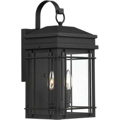 In a classic lantern style, this outdoor wall light is a beautiful addition to a porch or patio area. The straight-lined steel frame is covered in a textured black finish for handsome and stately look. Clear glass panels allow for a full look of the light bulbs inside, making decorative bulbs a great choice for this fixture.