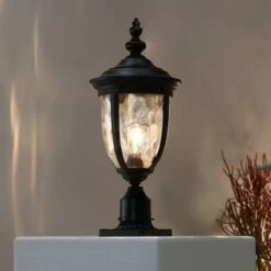 Brighten up your walkways, pathways, and driveways with this outdoor post light from the Bellagio collection. This traditional design comes in a texturized black finish and has clear hammered decorative glass for a sophisticated look. Use it to add a warm, welcoming glow to your home. Includes a pier mount adapter for surface-mount installation.
