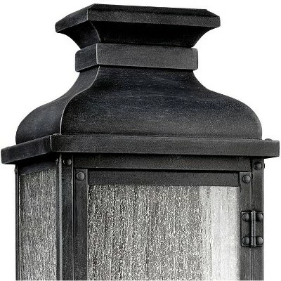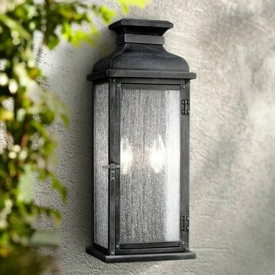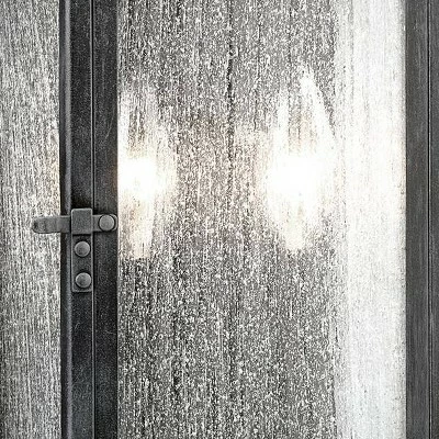 Romantic vintage attitude casts a spell of intrigue and old-time charm, turning this two-light outdoor wall light into a tasteful way to accentuate home and business structures. This elongated wall light from the Pediment collection by Feiss offers an aged flavor with a dark weathered zinc finish over stainless steel construction in a lantern style with ornate silhouetting. Textured glass panels offer a partial view of a candelabra style bulb base (bulbs not included).