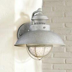 Update your outdoor lighting with this energy-efficient LED outdoor wall light inspired by industrial and barn light designs. A seedy glass orb surrounded by a small cage is paired with a galvanized finish, creating a handsome look. Made of steel construction made to look galvanized.