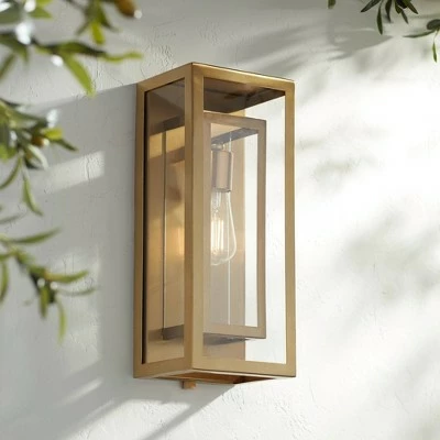 From Possini Euro Design, the handsome Double Box upright outdoor wall fixture features an outer frame of warm antique brass finish metal and clear glass. Inside, a second frame of clear glass. Together, they create a wall light that is worth your attention and will enhance your home’s exterior spaces.
